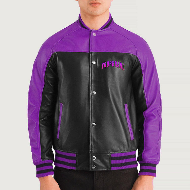 แจ็คเก็ตวาร์ซิตี้หนังบุรุษแบบวินเทจสั่งทำขายส่ง ปกคอพับ แต่งขอบยางยืด ปักลายพัฟพริ้นท์