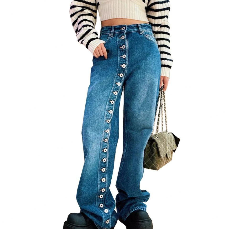 กางเกงยีนส์ทรงตรงแบบติดกระดุมสไตล์วินเทจสำหรับผู้หญิง ขายส่ง กางเกงยีนส์ทรงหลวมขาบานสไตล์สตรีทแฟชั่น
