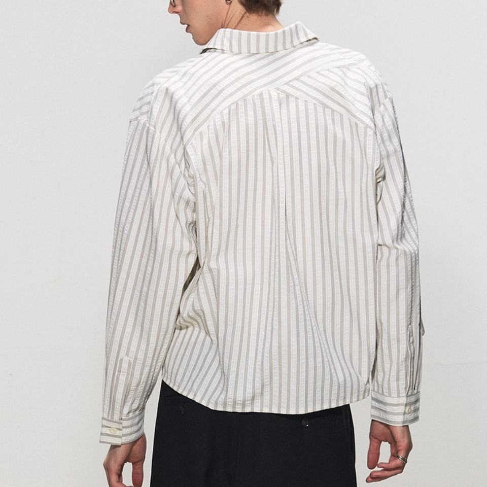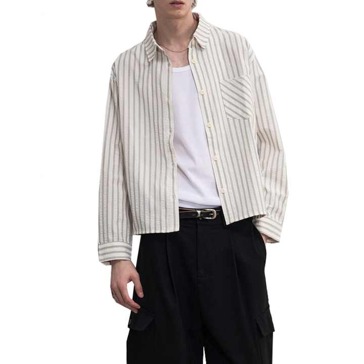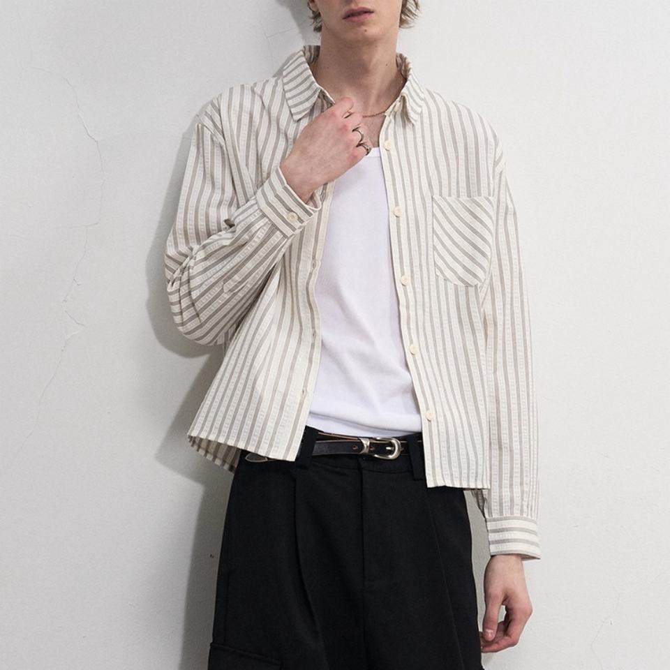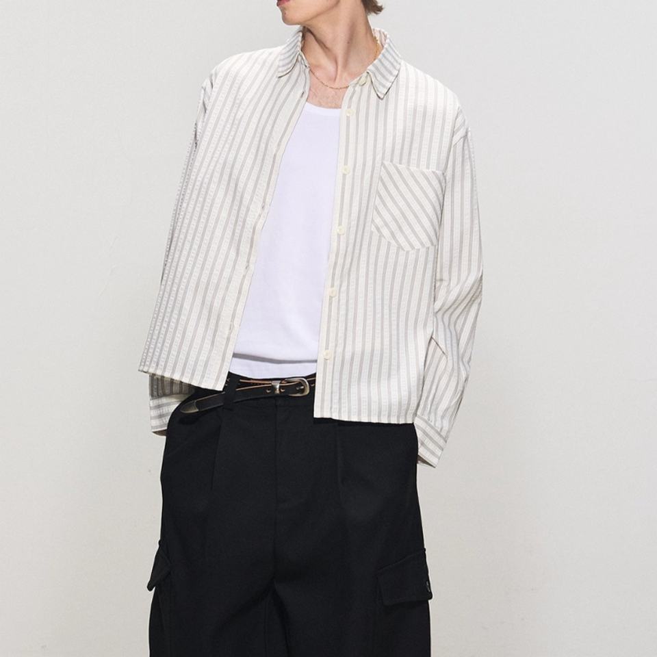 เสื้อเชิ้ตวินเทจลายทางขายส่ง ทรงตรง ไหล่ตรง แขนยาว แฟชั่นทรงบ็อกซ์ หลวม สไตล์เสื้อเชิ้ตผู้ชายแขนยาว