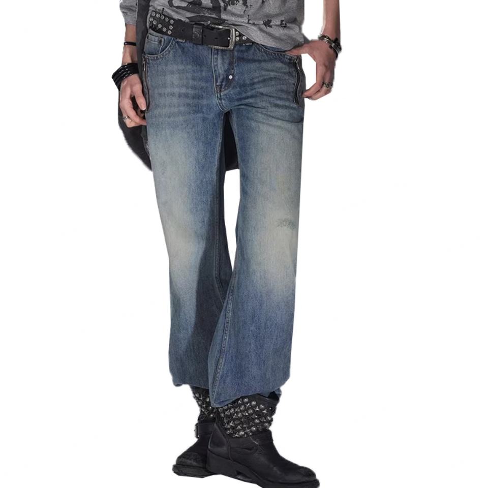 กางเกงยีนส์วินเทจทรงหลวมเอวต่ำสำหรับผู้ชาย สไตล์พังก์ร็อก แต่งขาด พร้อมกระเป๋าติดหมุดและซิปคู่ ขายส่ง