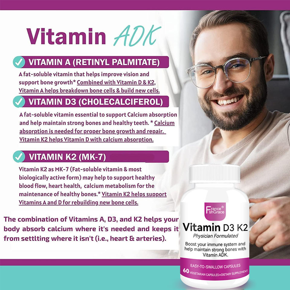 วิตามินดี3 เค2 แบบขายส่ง บำรุงสุขภาพกระดูก ช่วยการดูดซึมแคลเซียม พร้อมวิตามินเอดีเค 60 แคปซูล สารสกัดวิตามินดี3 เค2
