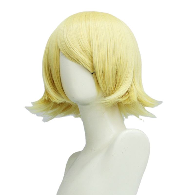 ขายส่งVocAloid Rin/Len Kagamineวิกผมคอสเพลย์ 14 นิ้วสั้นหยิกGolden Syntheticอะนิเมะคอสเพลย์เครื่องแต่งกายผมวิกผมสําหรับงานปาร์ตี้