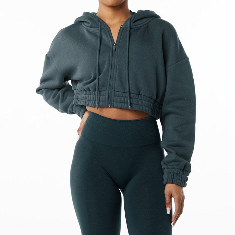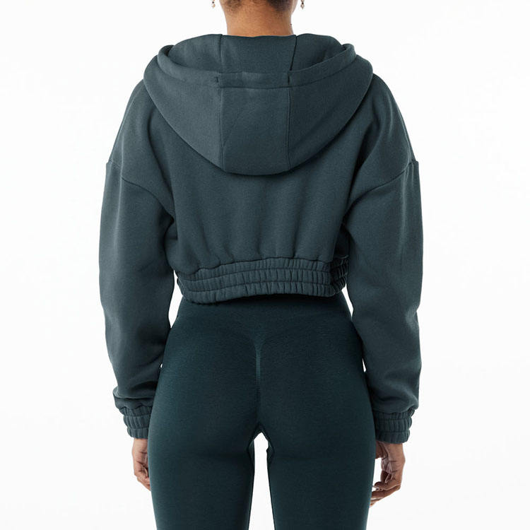 แจ็กเก็ตแบบสวมหัวของผู้หญิงเสื้อครอปแบบมีฮู้ดผ้าโพลีเอสเตอร์สีทึบแบบรูดซิปด้านบน