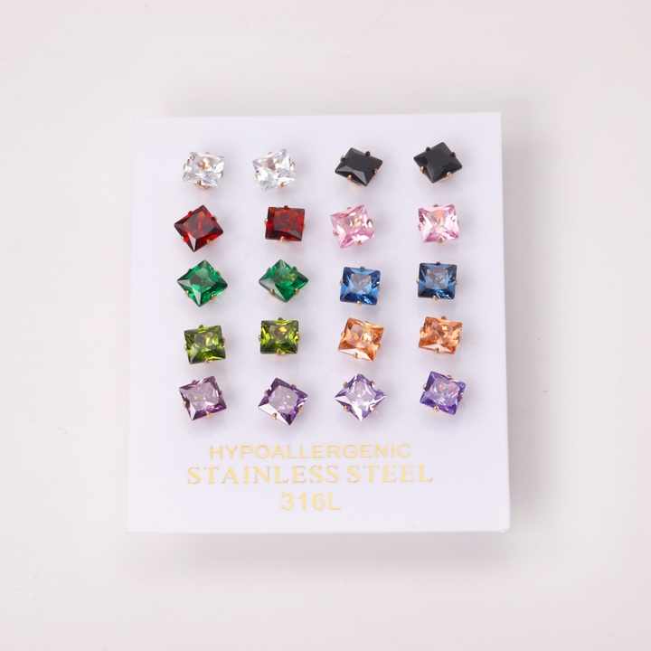 ต่างหูแบบติดหู สแตนเลสสตีลชุบ PVD 18K กันน้ำ ขายส่ง ประดับด้วยเพชรซิคอนหลากสีทรงสี่เหลี่ยมเล็ก ทันสมัย ไม่หมอง