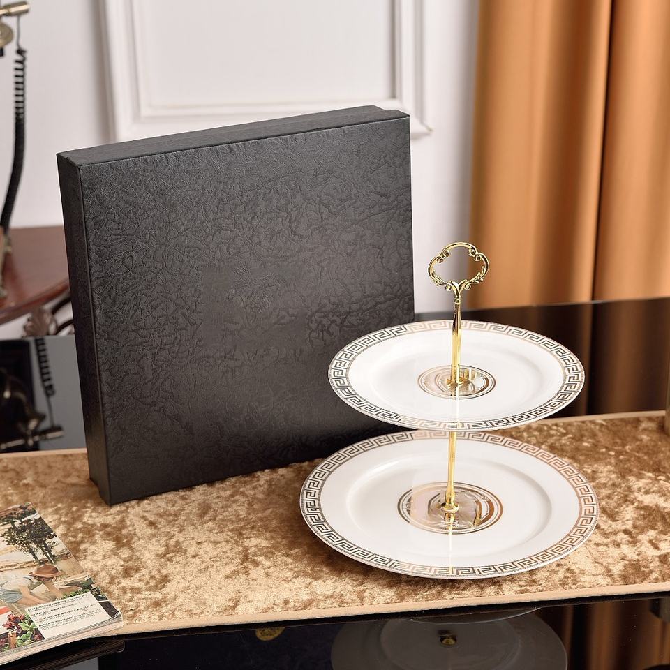 จานเค้กผลไม้2ชั้นสไตล์ยุโรปหรูหราตะวันตกสำหรับห้องนั่งเล่นจานขนมพอร์ซเลน