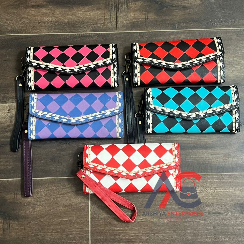 กระเป๋าสตางค์คล้องมือหนังลายตารางหมากรุกทำมือ