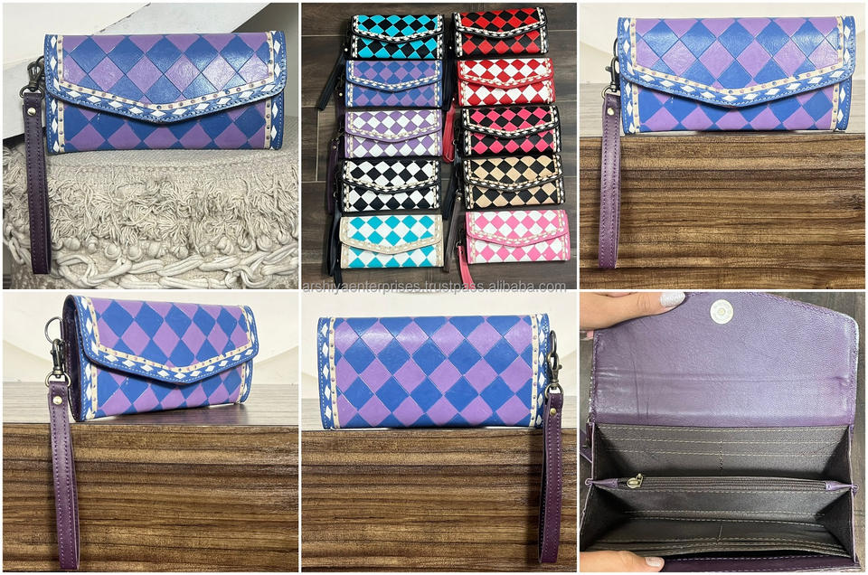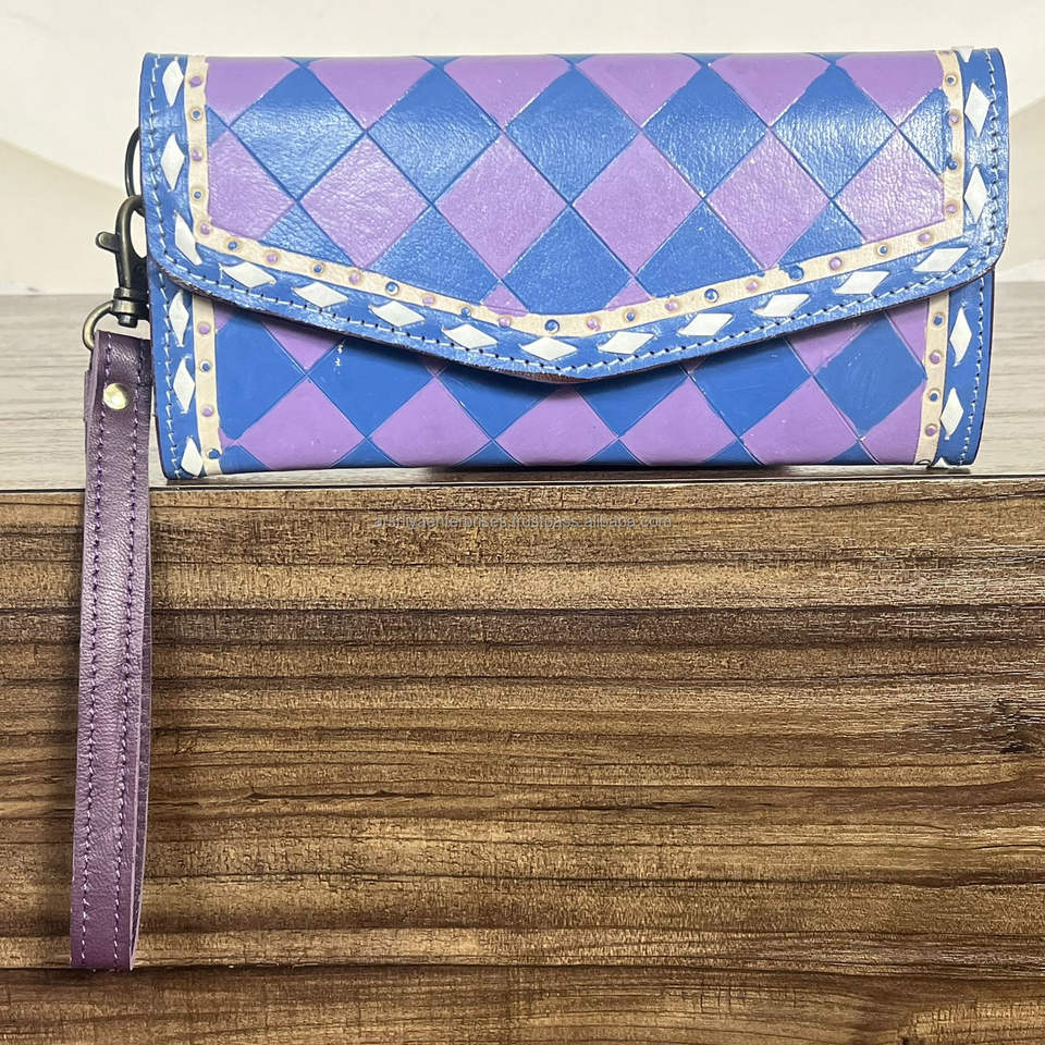 กระเป๋าสตางค์หนังแท้สไตล์ตะวันตกสำหรับผู้หญิง ลายตารางสีม่วงและขาว ตกแต่งด้วยมือ พร้อมสายคล้องข้อมือแบบถอดได้