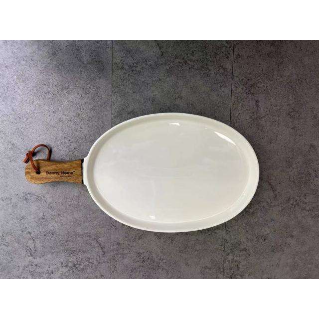 Wholesale White Ceramic Platter with Wooden Handle Low MOQ Elegant Oval Serving Tray for Home Decor Kitchen Dining Room Use