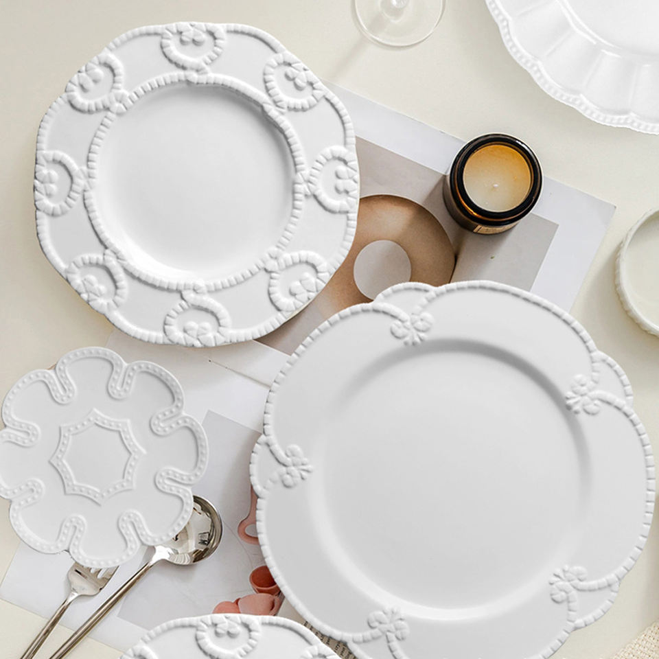 จานเซรามิกสำหรับงานแต่งงานจานเซรามิกลายนูนสีขาว
