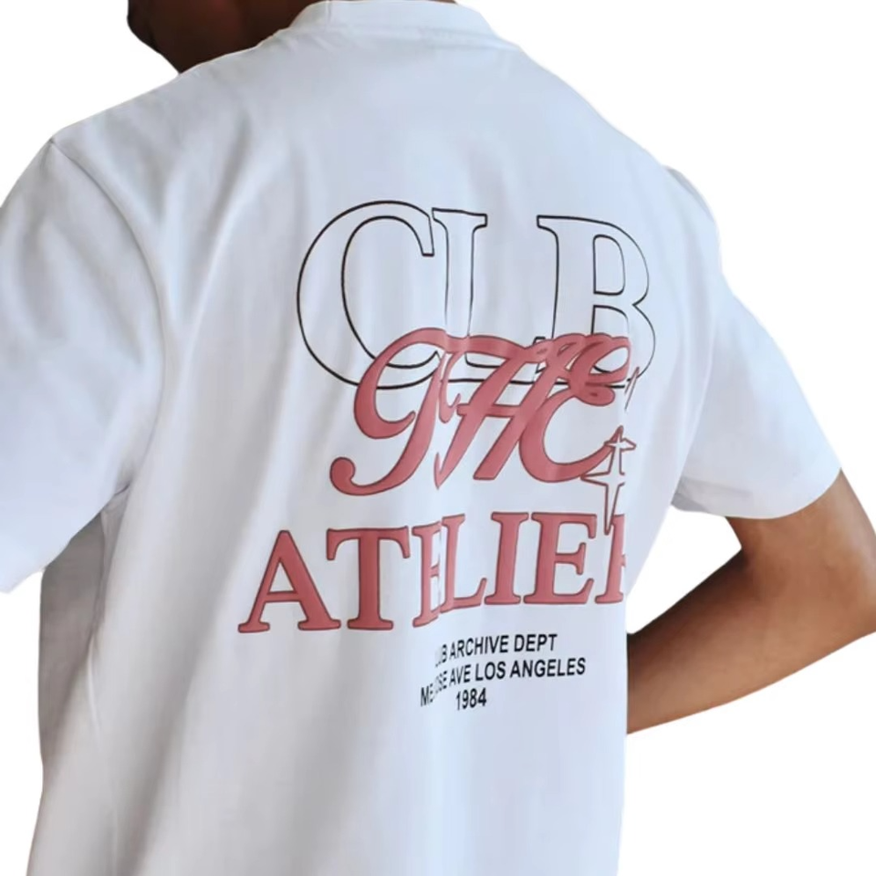 Wholesale White Oversized T Shirt with Club Atelier Print Melrose Los Angeles Graphic Cotton Tee Trendy Streetwear Fashion Top