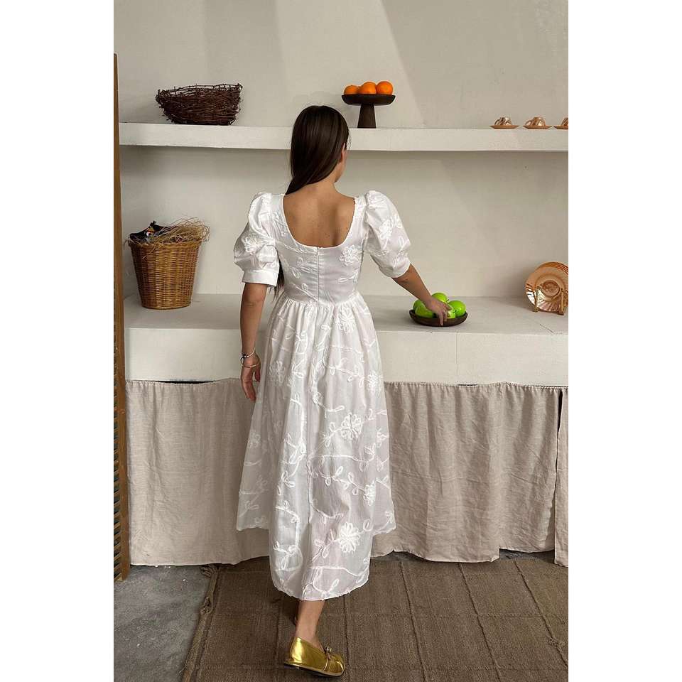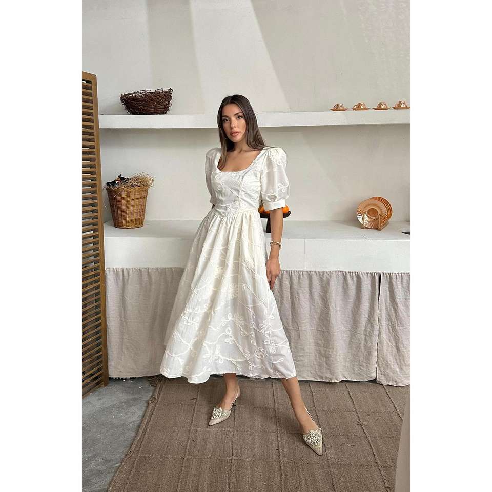 เดรสแฟชั่นวินเทจสีขาวขายส่ง แขนทรงบอลลูน ปักลาย คอเหลี่ยม รับทำโลโก้ แต่งระบาย ไซส์ XL สำหรับโอกาสฤดูใบไม้ผลิ