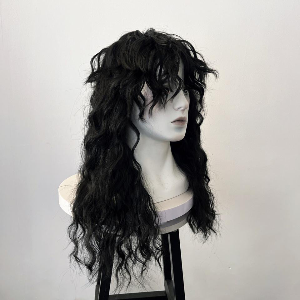 วิกผมพังค์ร็อกสีดำผมยาวหยิกเป็นลอนสำหรับผู้ชายวิกผมยาวสารเคมี