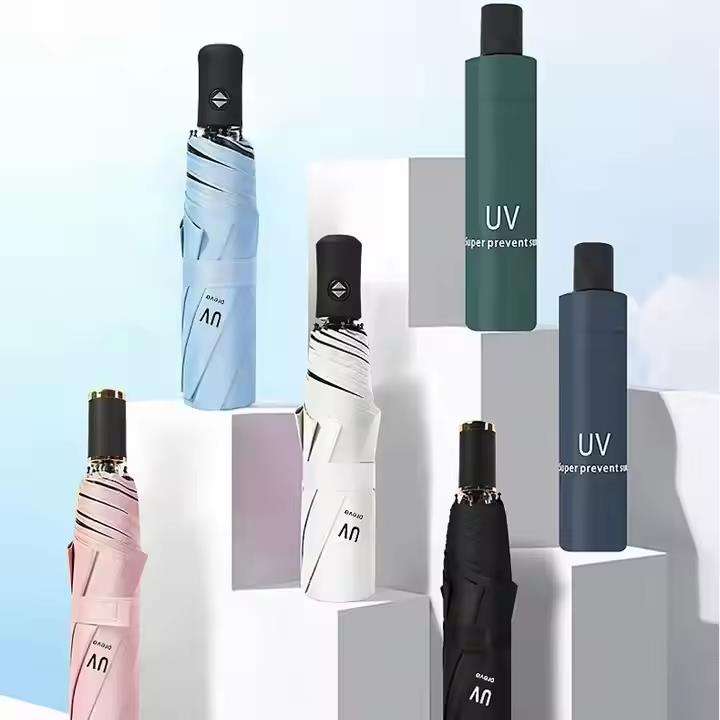 ร่มพับอัตโนมัติขนาดเล็กพกพาสะดวกกันลมพร้อมซอง ร่มกันแดด UV แบบกำหนดเองพร้อมโลโก้