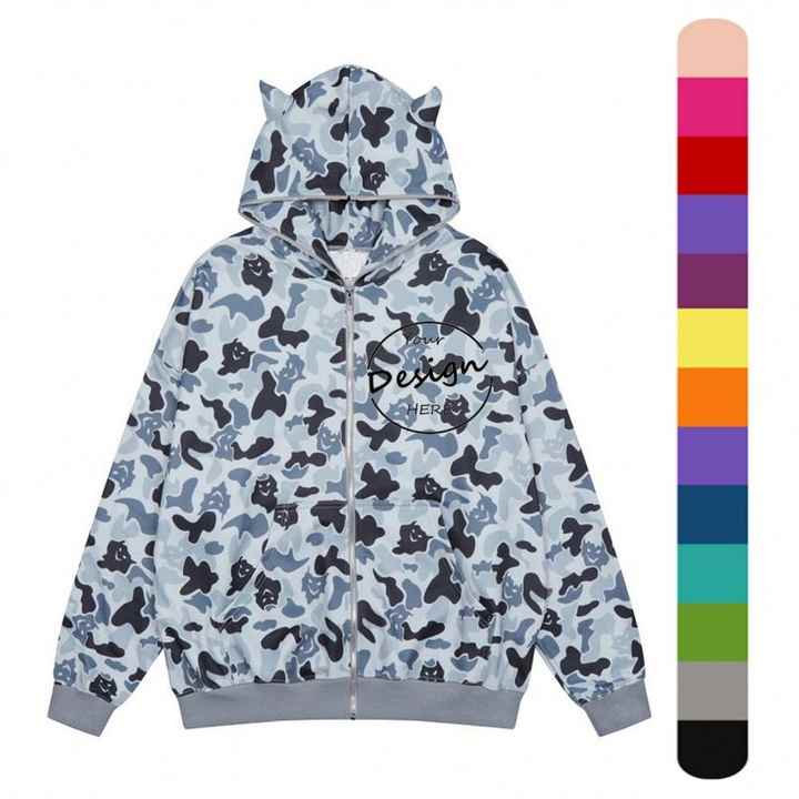 เสื้อฮู้ดลายพรางแขนยาวสำหรับผู้หญิงเสื้อฮู้ดลายมอนสเตอร์มีซิปพิมพ์ลายแฟชั่นฤดูหนาว