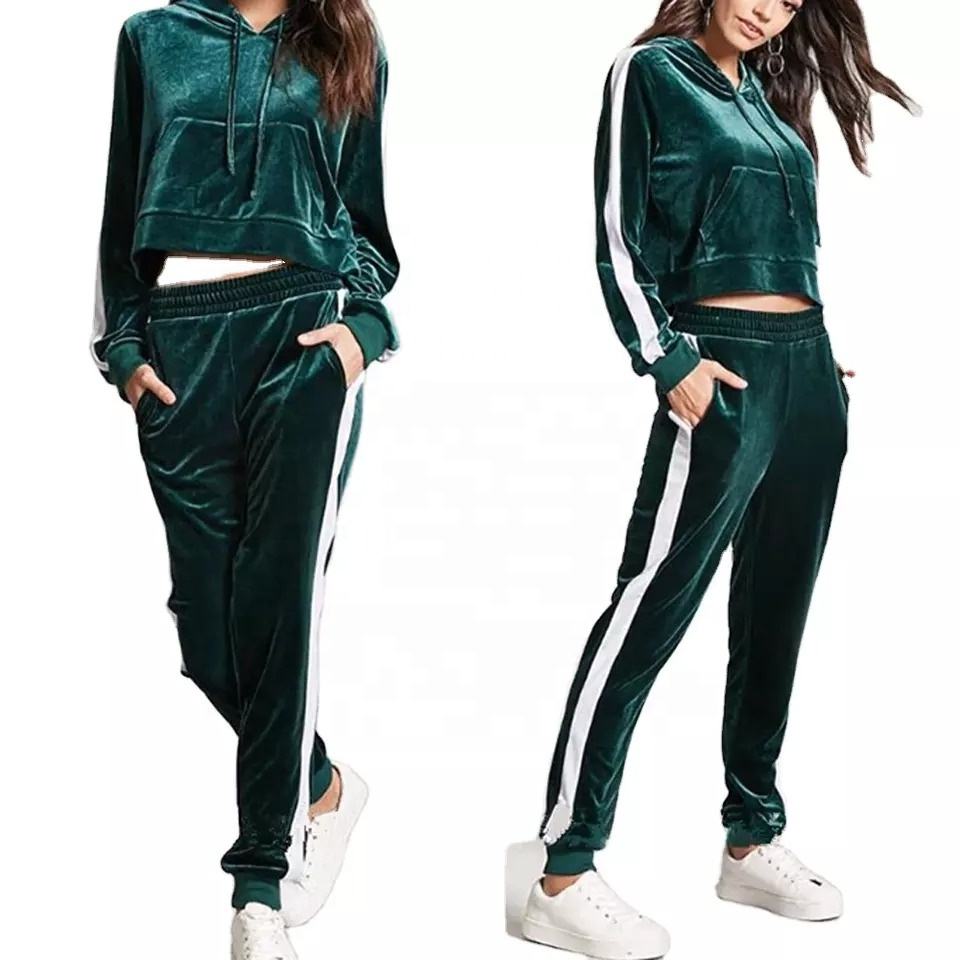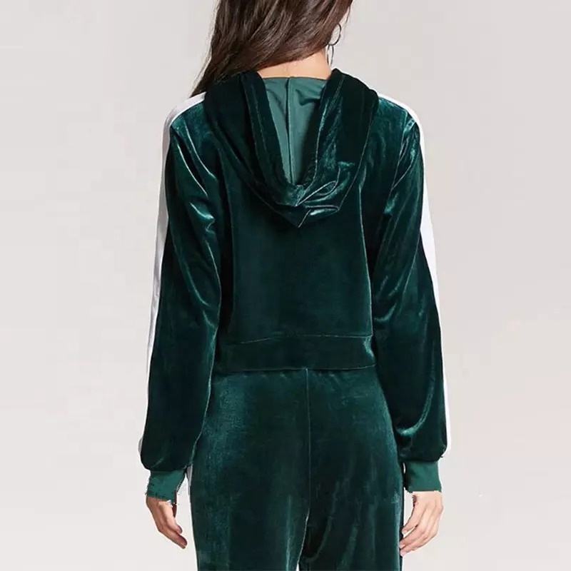 ชุดเซ็ตสองชิ้นแฟชั่นฮิปฮอปสำหรับผู้หญิง ผ้ากำมะหยี่สีเขียว แบบมีฮู้ด สำหรับฤดูหนาว ผลิตจากผ้าสแปนเด็กซ์/คอตตอนที่เป็นมิตรต่อสิ่งแวดล้อม ขายส่ง