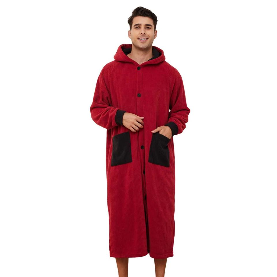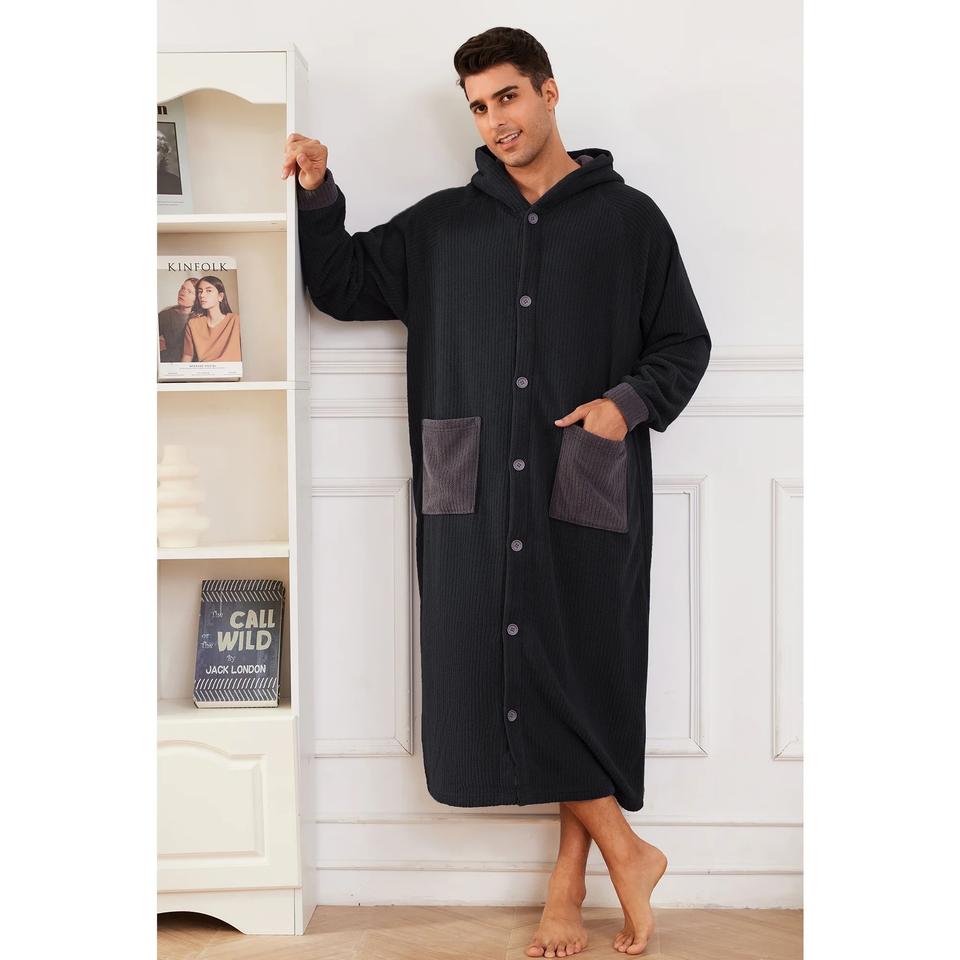เสื้อคลุมอาบน้ำผ้าฟลีซสำหรับผู้ชายเสื้อคลุมนอนพร้อมฮู้ดและกระเป๋าสองช่อง