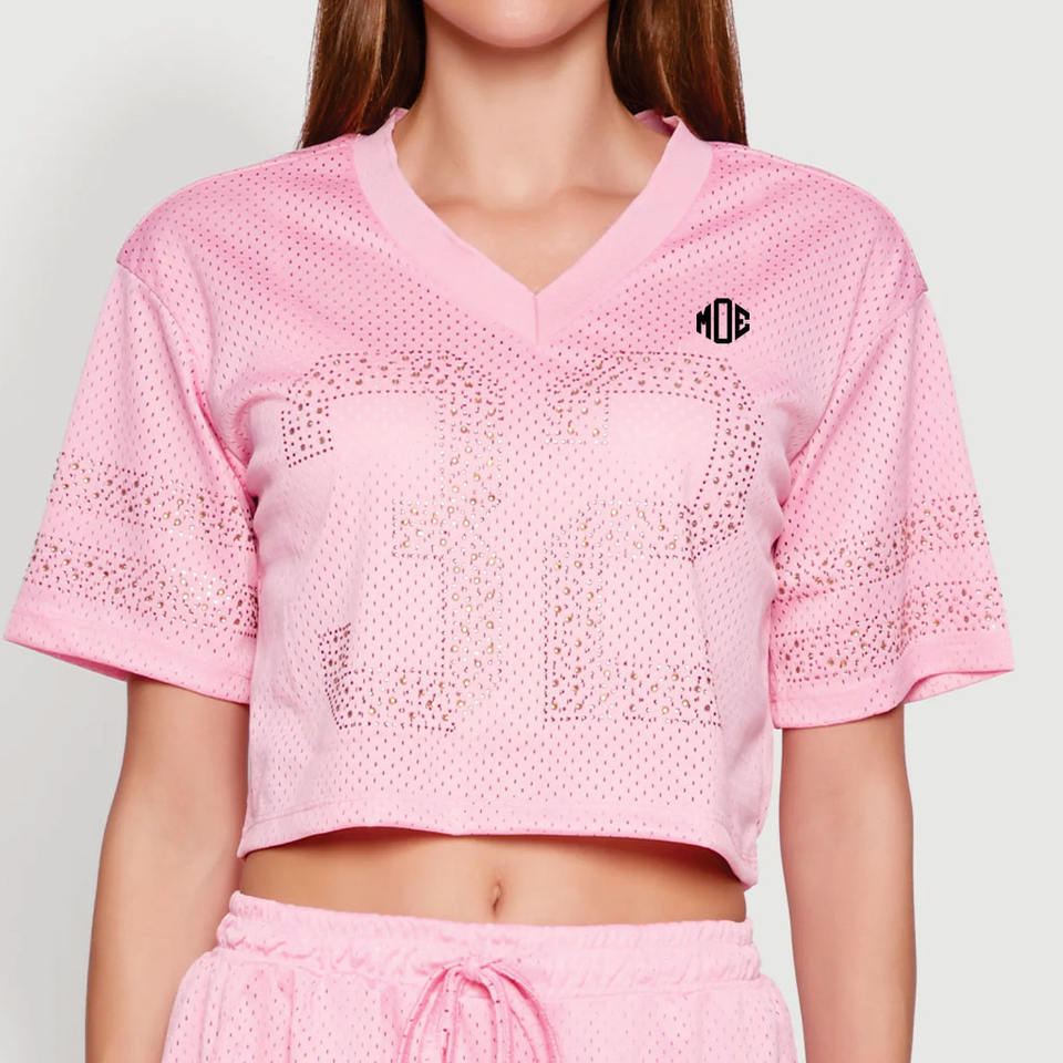 ชุดเสื้อฟุตบอลอเมริกันสไตล์สตรีทสำหรับผู้หญิงขายส่ง เสื้อครอปประดับเพชรพลอยสีชมพู กางเกงขาสั้นรัดเชือก ชุดกีฬา OEM สหรัฐอเมริกา