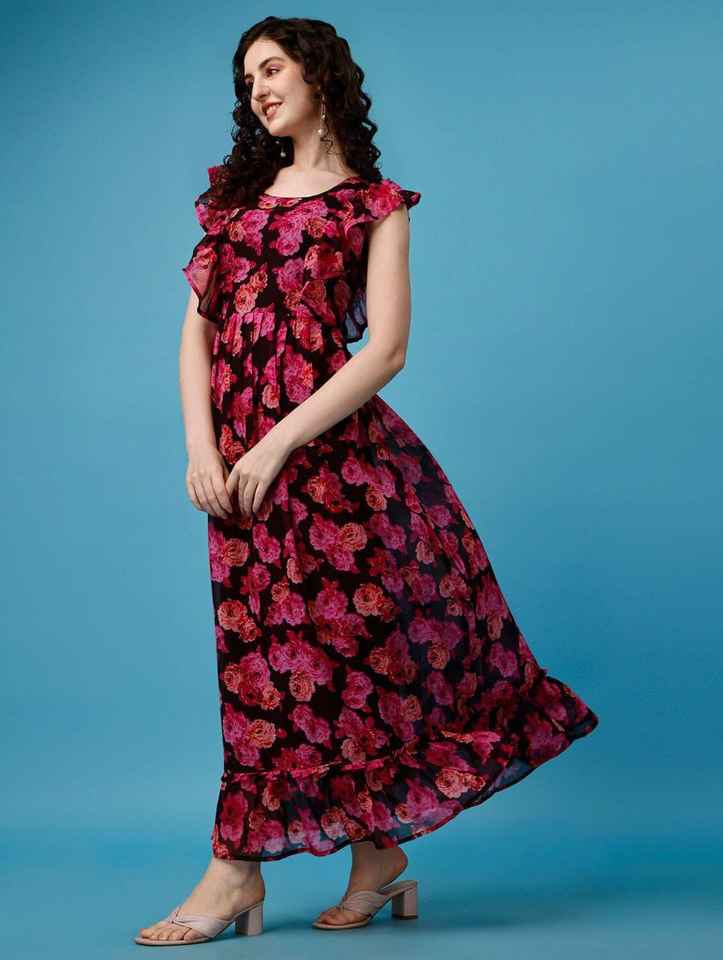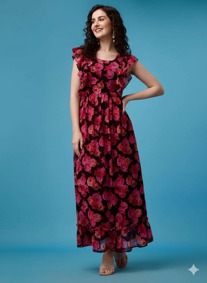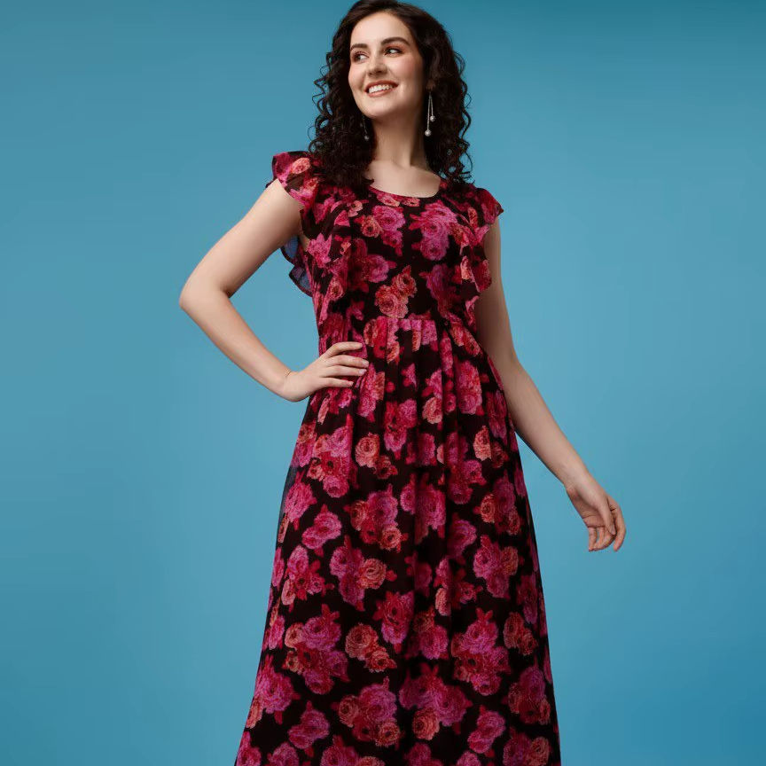 เดรสยาวพิมพ์ลายดอกไม้สีแดงเข้มของผู้หญิงผ้าจอร์เจ็ตผ้าเครปขนาด M L XL XXL ขายส่ง