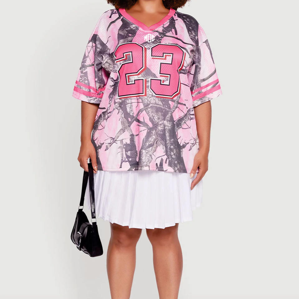 เสื้อเจอร์ซีย์อเมริกันฟุตบอลลายพรางสีชมพูสำหรับผู้หญิงขายส่ง เสื้อกีฬาคอวีสีชมพูทรงโอเวอร์ไซส์ ผ้าตาข่าย รับผลิตตามสั่งสำหรับทีม OEM