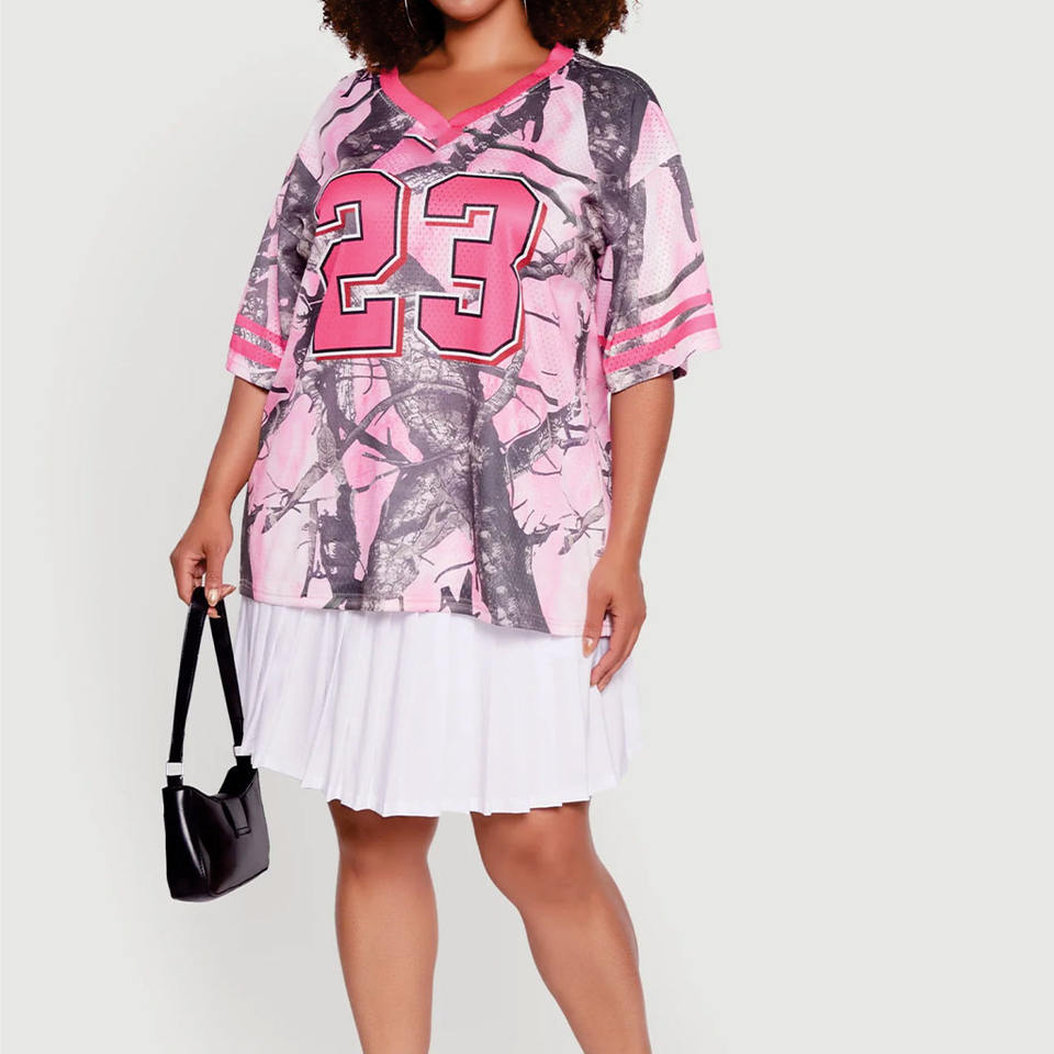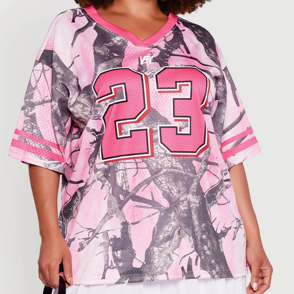 เสื้อเจอร์ซีย์ลายพรางสีชมพูสำหรับผู้หญิงขายส่ง เสื้อกีฬาคอวีสีชมพูตัวใหญ่ ผ้าตาข่าย สั่งทำชุดทีม OEM เสื้ออเมริกันฟุตบอล