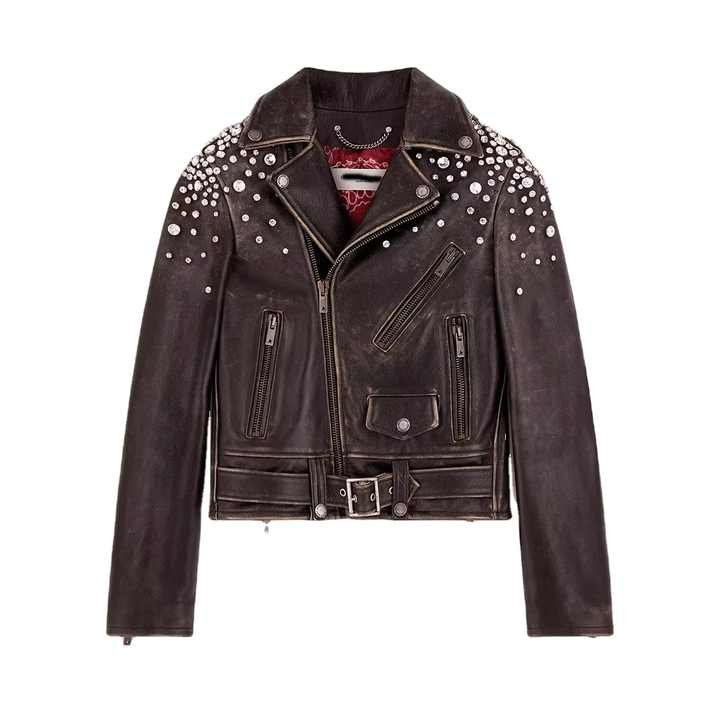 แจ็คเก็ตหนังแท้ประดับเพชรสำหรับผู้หญิง ขายส่ง คุณภาพสูง ดีไซน์พรีเมียม แจ็คเก็ตหนังสีน้ำตาลสำหรับผู้หญิง