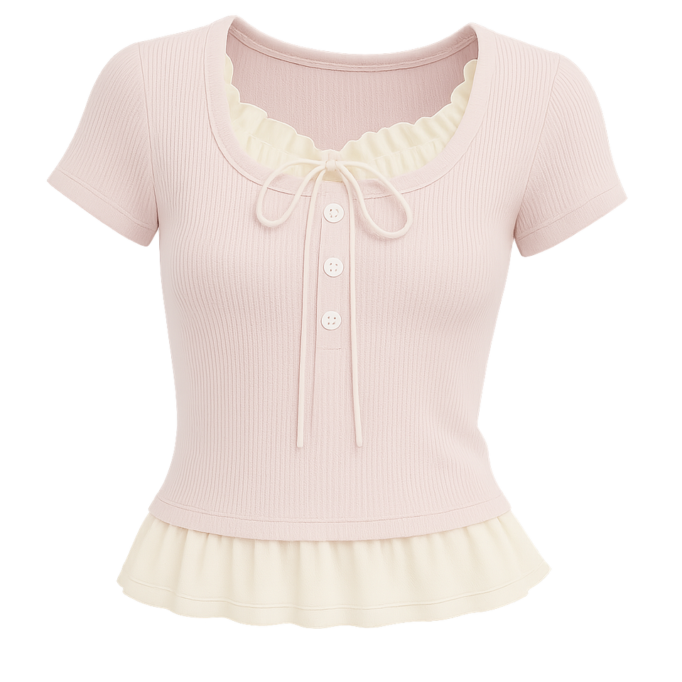 เสื้อถักลูกไม้สีทึบสำหรับผู้หญิงเสื้อลำลองแขนสั้นสไตล์หวานลำลองสำหรับหญิงสาว100% ผ้าฝ้าย