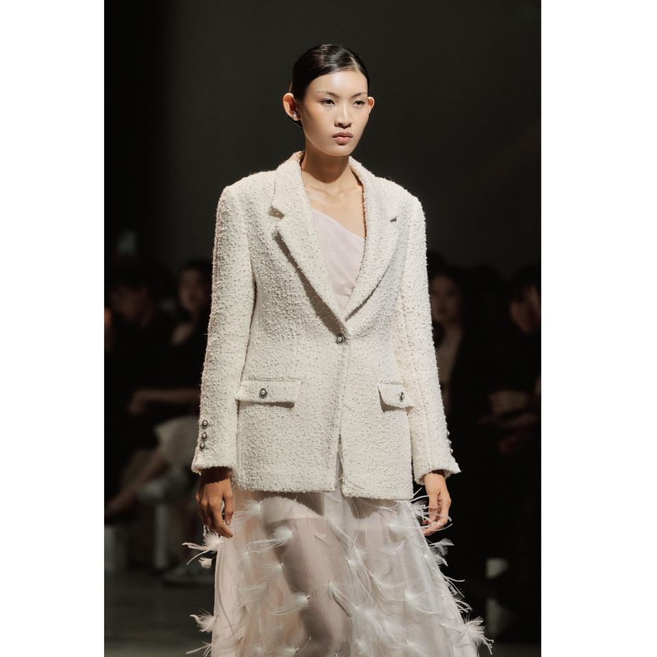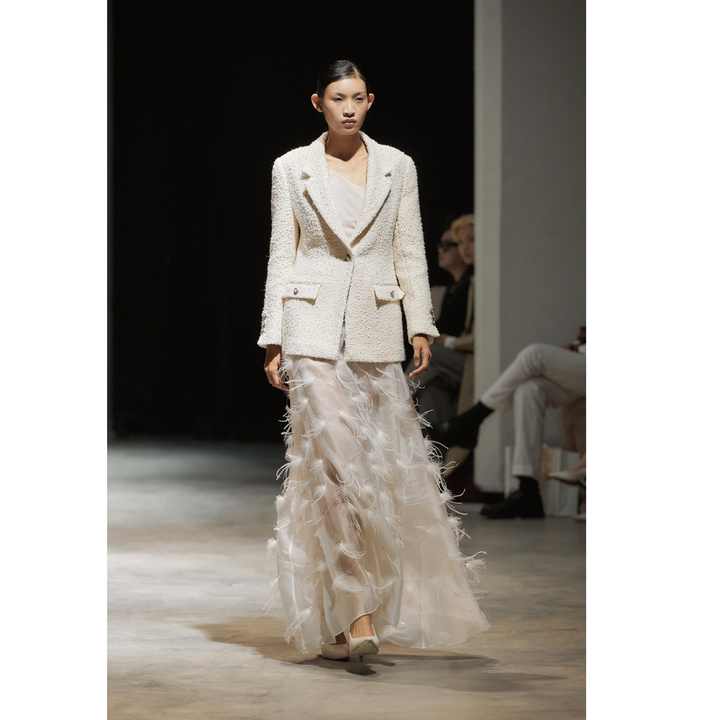 กระโปรงผู้หญิงขายส่ง เสื้อผ้าหรูหรา MILAN EMB FEATHER SKIRT ผู้หญิง ODM ทุกฤดูกาล 300 กรัม สีขาว สีดำ กระโปรงผู้หญิง