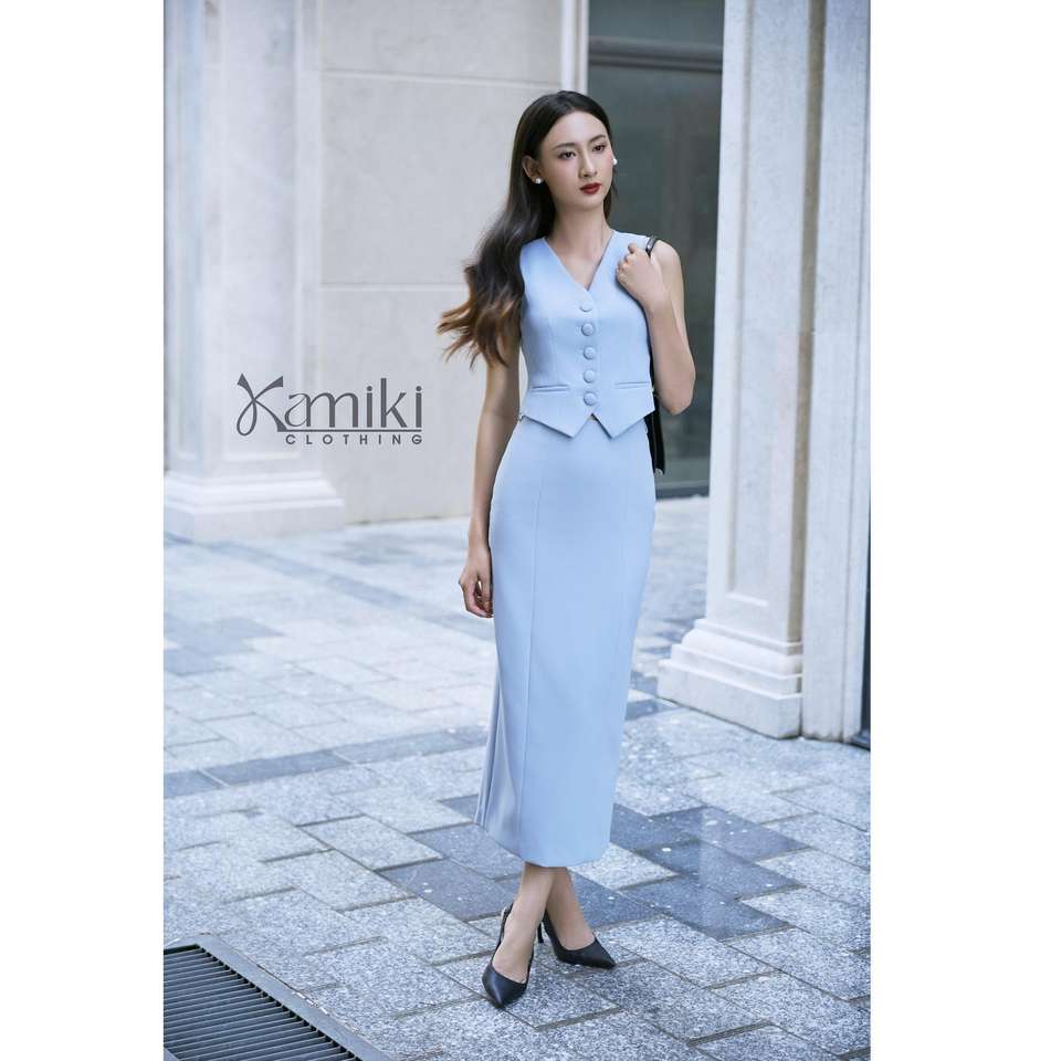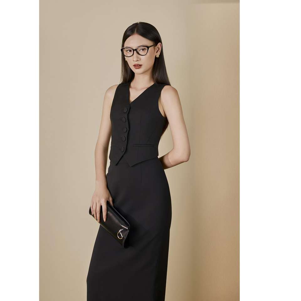 เสื้อกั๊กทวิลล์ผู้หญิงขายส่ง แบบอเมริกัน ทอทวิลล์ คอวี ติดกระดุมแถวเดียว ย้อมสีพื้น ผ้าวอร์สเตด ทรงเข้ารูป สไตล์ออฟฟิศ ผลิตในเวียดนาม