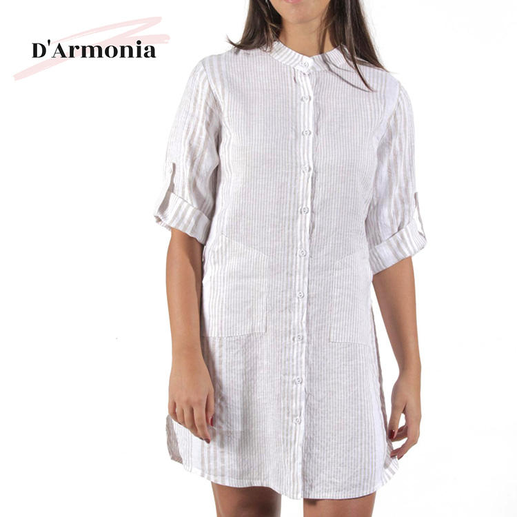 Wholesale Women White Striped Half Sleeve Linen Woven Loose Casual Shirt Dress