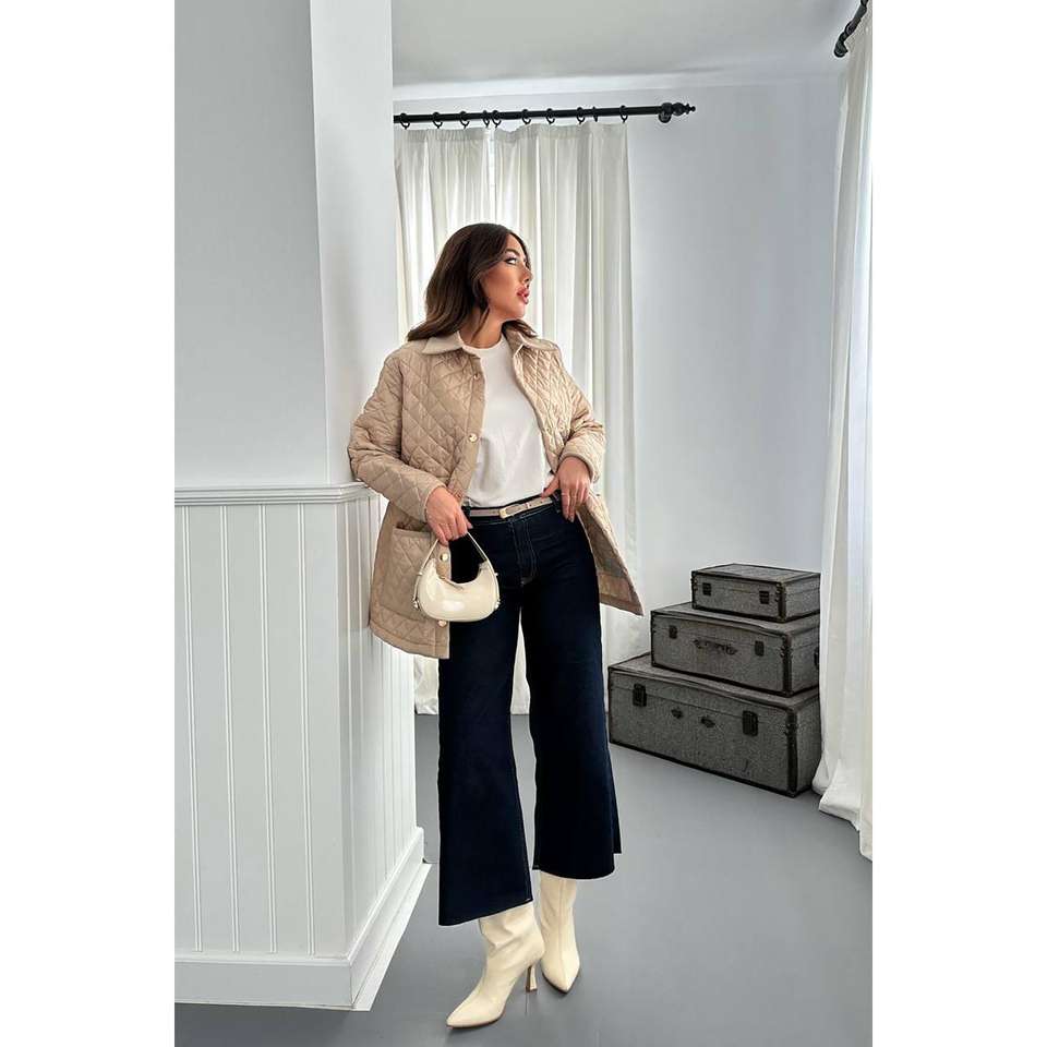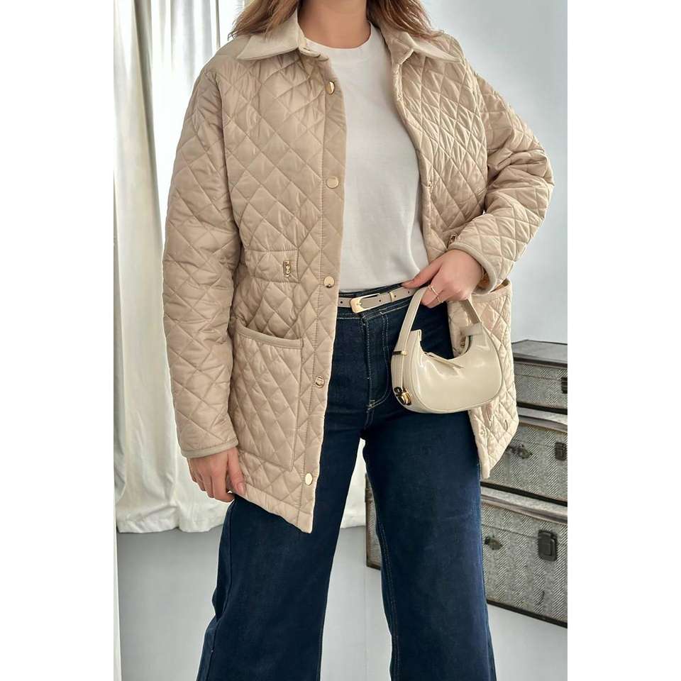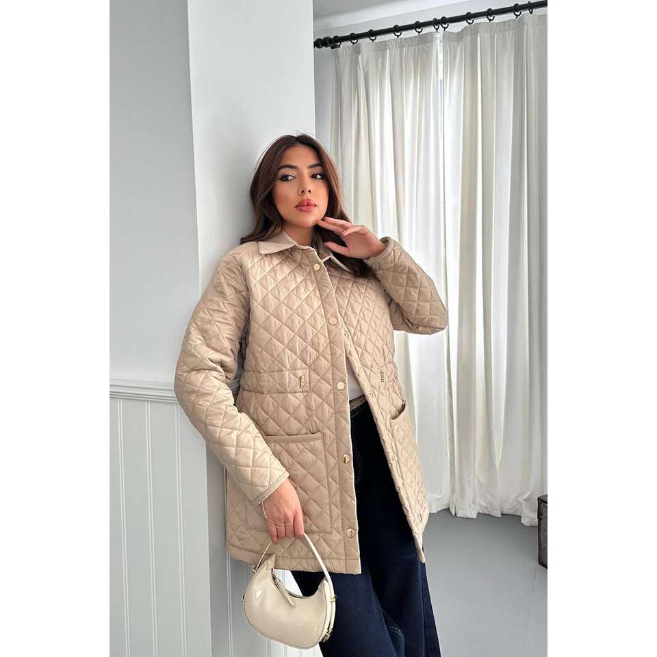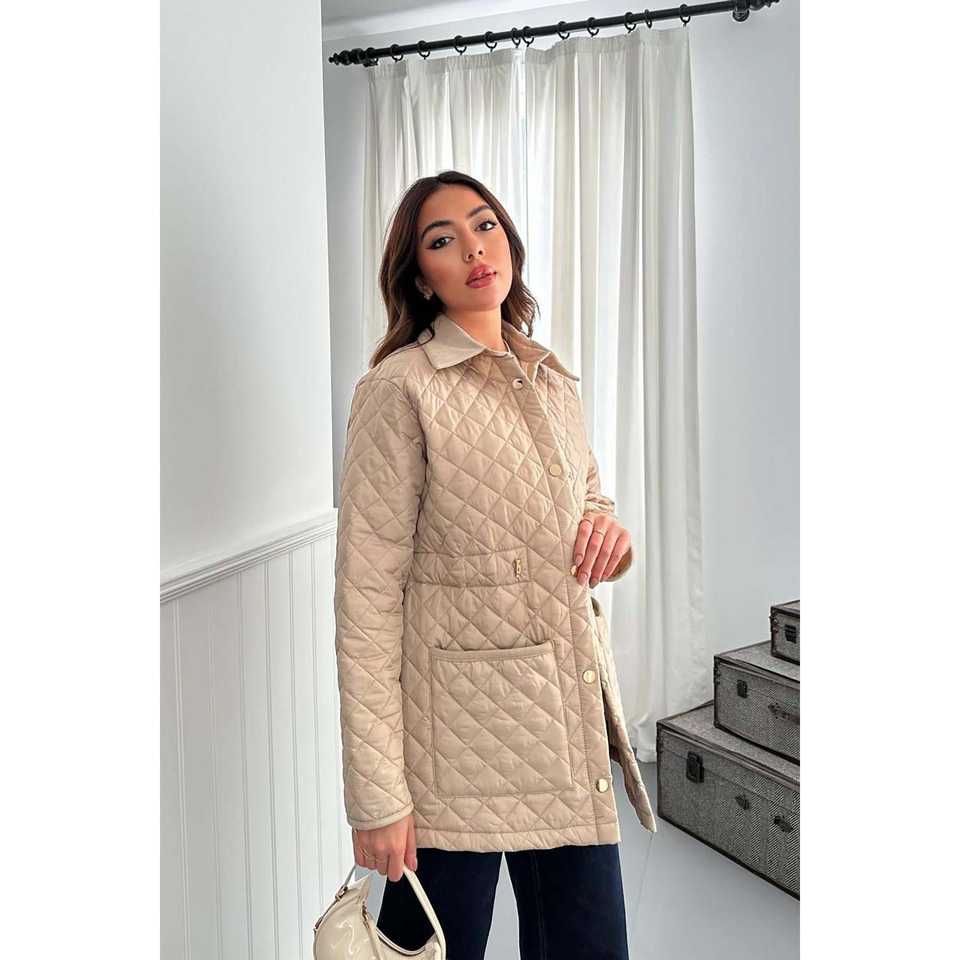 เสื้อแจ็คเก็ตผู้หญิงสีเบจแบบเย็บลาย พร้อมปก ทำจากหนังกลับ ขายส่ง