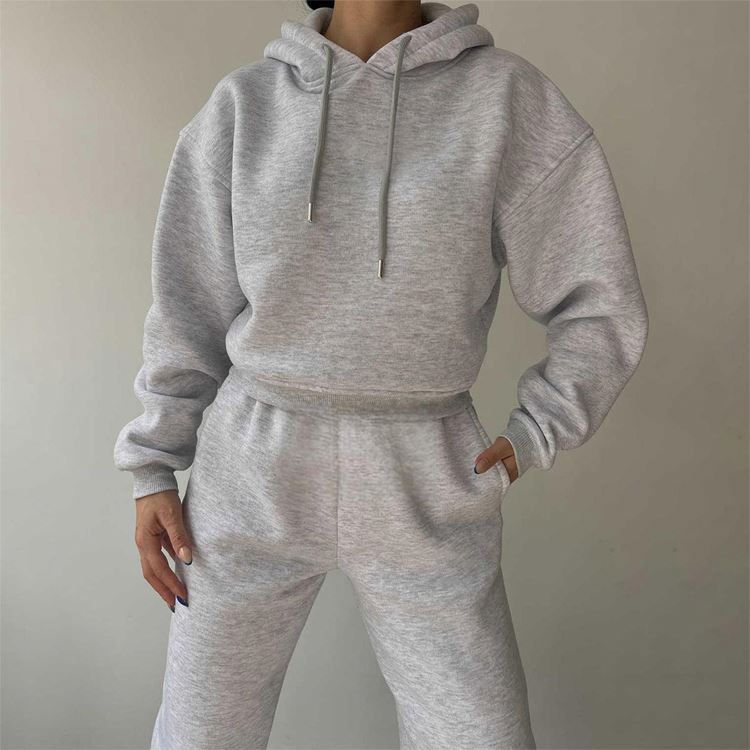 ชุดเซ็ตแทรคสูทลำลองผู้หญิงแบบ 2 ชิ้น ขายส่ง เสื้อฮู้ดและกางเกงขายาวทรงเข้ารูป ปักลาย ODM