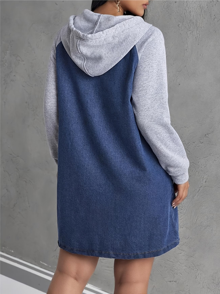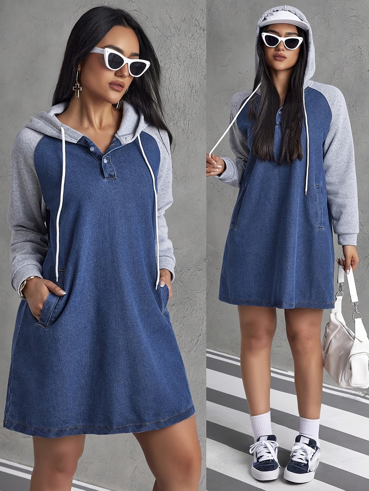 เดรสผ้าเดนิมถักทรงลำลองสไตล์วินเทจสำหรับผู้หญิง ขายส่ง ความยาวระดับเข่า แต่งสีตัดต่อ พิมพ์ลายตัวอักษร ย้อมสีพื้น มีเชือกผูกเอว มีกระเป๋า