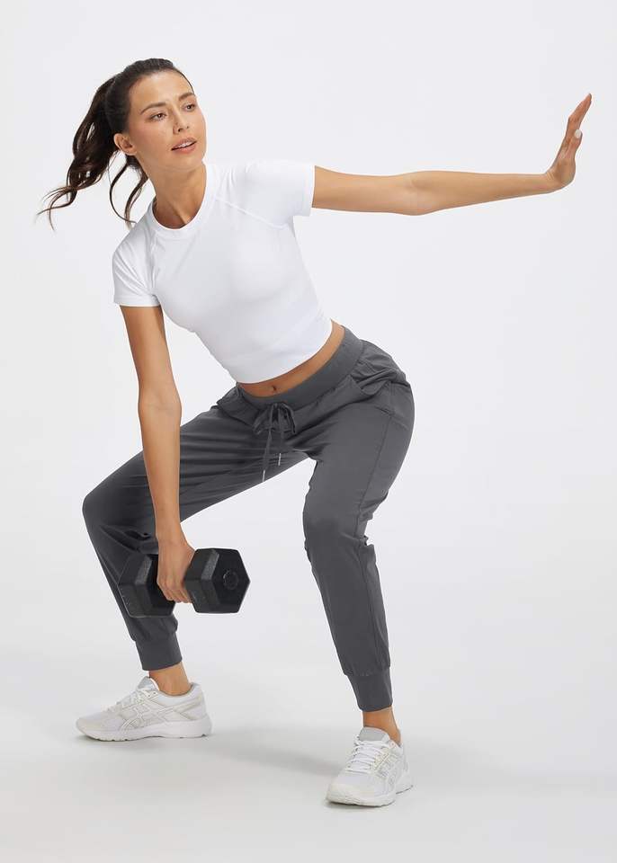 กางเกงจ็อกเกอร์ขายส่งสำหรับผู้หญิง ระบายอากาศได้ดี น้ำหนักเบาปานกลาง กางเกงวิ่งมีกระเป๋า แห้งเร็ว ทรงสปอร์ต ความยาวระดับข้อเท้า มีเชือกผูก
