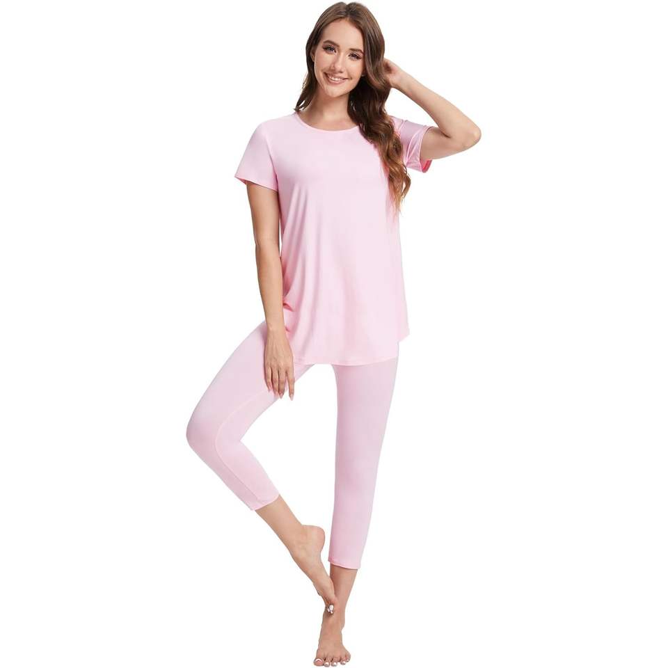 ชุดนอนผู้หญิงขายส่ง ผ้าวิสโคสผสมใยไผ่ แขนสั้น เสื้อคลุม กางเกงขายาวแบบแคปรี ชุดนอนเย็นสบาย เนื้อผ้านุ่ม ไซส์ S-XXL