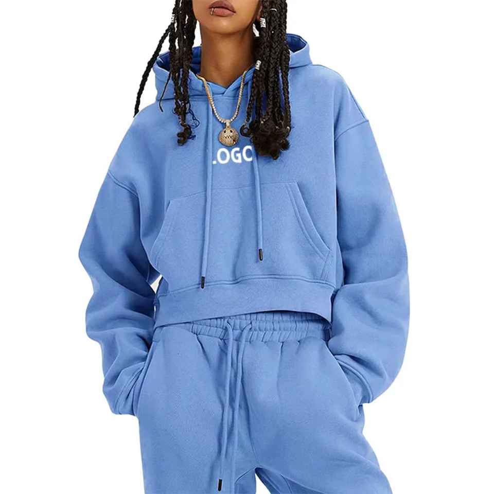 ชุดครอปมีฮู้ดพิมพ์ลายสำหรับผู้หญิงชุดออกกำลังกายฟิตเนส2ชิ้นชุดวอร์มกางเกงสำหรับผู้หญิง