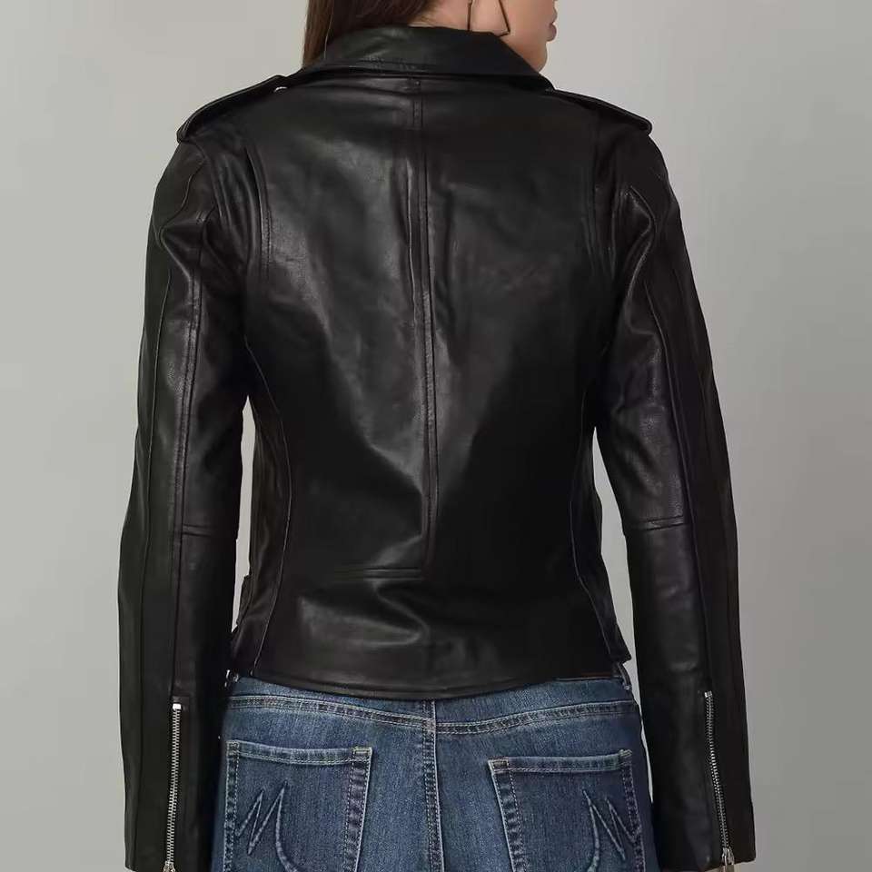 แจ็กเก็ตหนังแกะแท้สำหรับผู้หญิงมีซิปปิดตัวยาวสั้นสไตล์นักขี่จักรยานสำหรับฤดูหนาวโลโก้ตามสั่ง