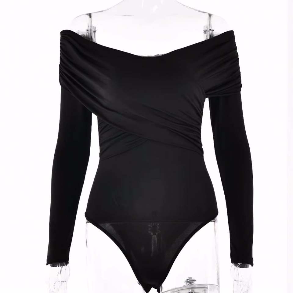 บอดี้สูทเซ็กซี่ของผู้หญิงคอวีเปิดไหล่แขนยาวผ่าข้างลำลองดีไซน์ยาวระดับเข่าสำหรับฤดูใบไม้ผลิสินค้าส่งออก