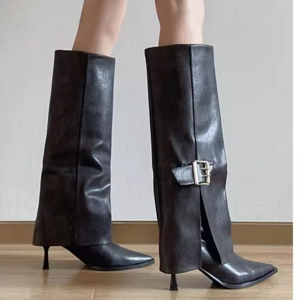 รองเท้าบูทส้นเข็มทรงสูงเหนือเข่าสำหรับผู้หญิง ขายส่ง สีดำ หนังแท้ สำหรับใส่กลางแจ้ง ปลายแหลม ดีไซน์หรูหรา