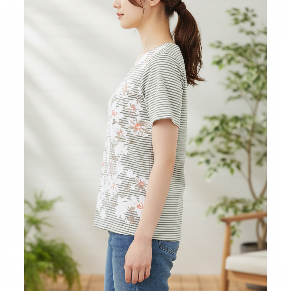 ชื่อสินค้า:เสื้อผู้หญิงน้ำหนักเบา ลายพฤกษศาสตร์บนพื้นลายทาง
