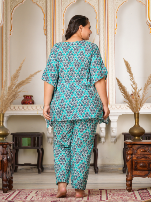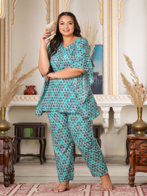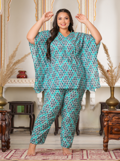 ชุดนอนคัฟตันผ้าฝ้ายพิมพ์ลายเรขาคณิตปักลายสำหรับผู้หญิง ขายส่ง คอวี แขนยาว สวมใส่สบาย ทรงหลวม หลายสี