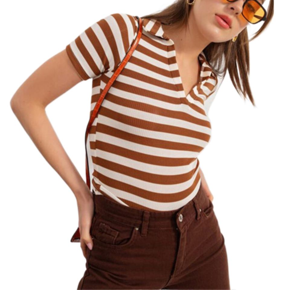 เสื้อโปโลผู้หญิงคุณภาพสูงแบบเรียบ สีตามสั่ง สไตล์ใหม่ เสื้อยืดลำลองลายทาง เสื้อโปโลลายทางสำหรับผู้หญิง ขายส่ง