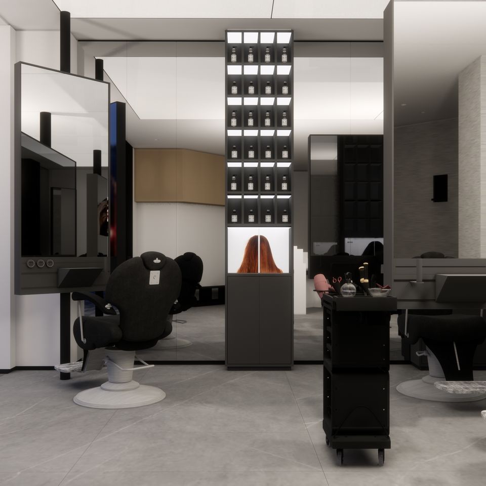 ขายส่งตู้โชว์กระจกไม้ป้ายที่กําหนดเองชั้นยืนตู้แสดงชั้นวางวิกผมสําหรับการออกแบบร้านตัดผมที่ทันสมัย