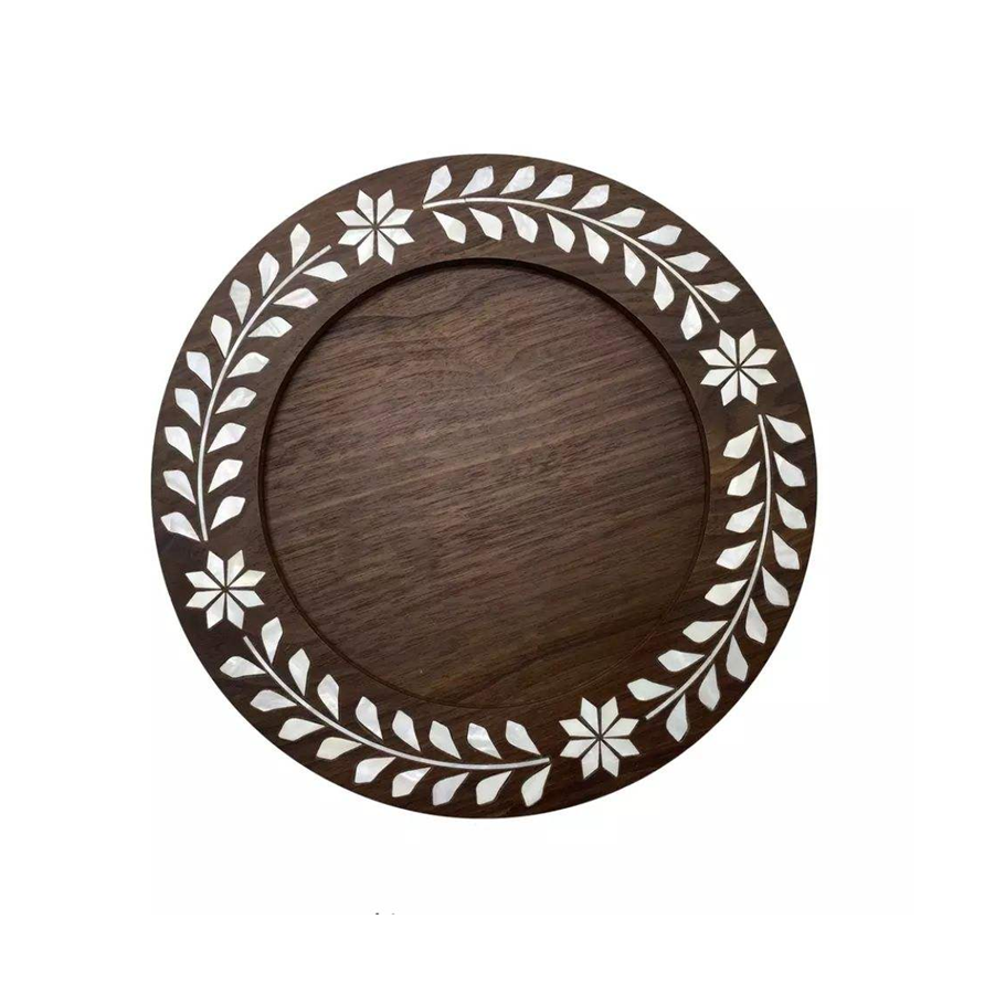 ถาดเสิร์ฟช็อกโกแลตไม้และฝังมุกสำหรับขายส่ง ของขวัญรอมฎอนและอีด ถาดเสิร์ฟไม้ทรงกลมอะคาเซีย ดีไซน์ลายมุก