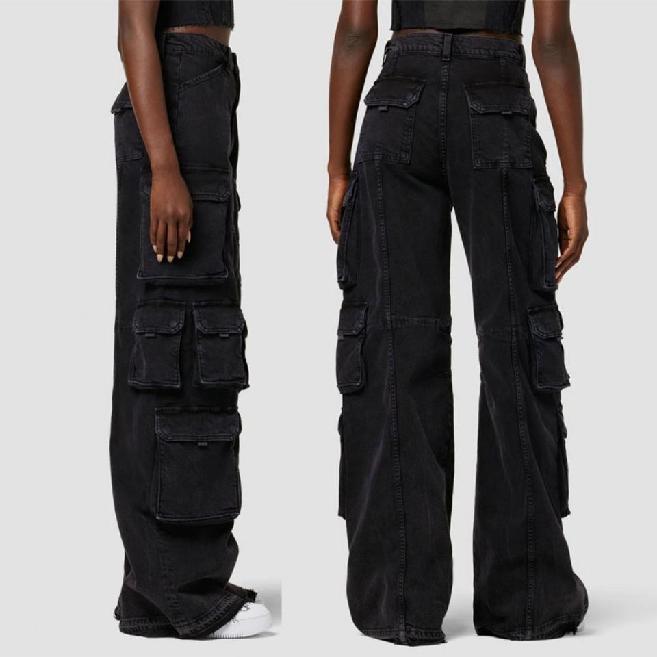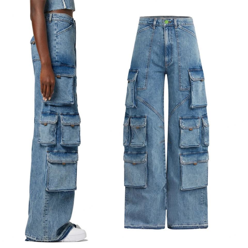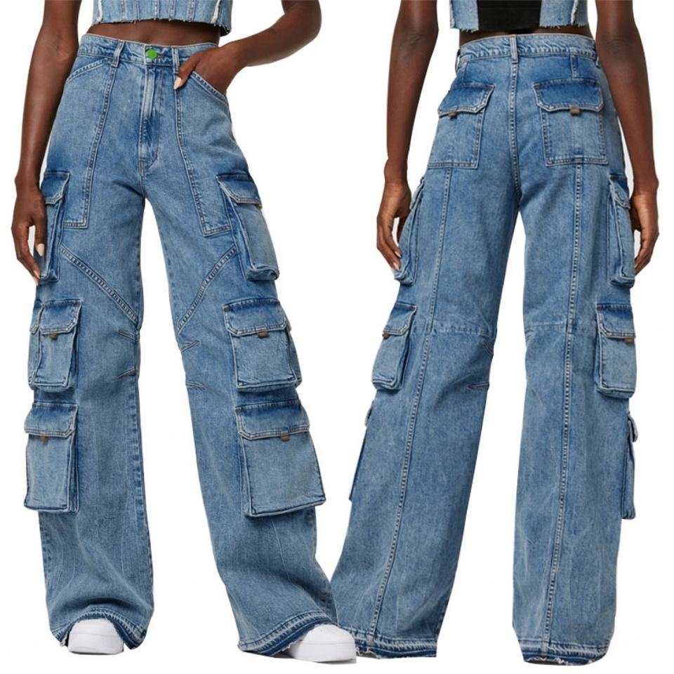 กางเกงยีนส์ผู้หญิงทรงขากว้างเอวสูงสไตล์คาร์โก้