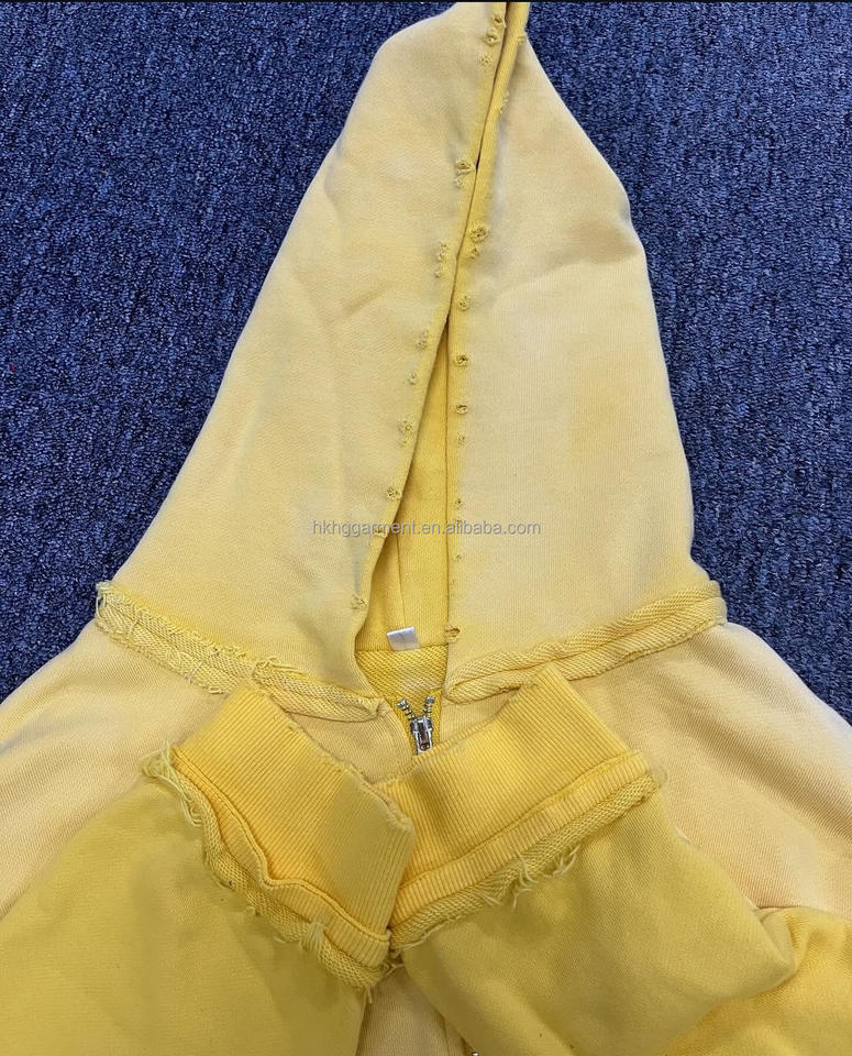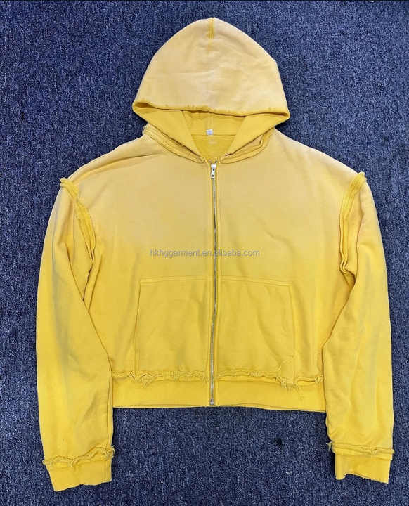 เสื้อฮู้ดดี้โอเวอร์ไซส์แบบซิป ขอบดิบ ตัดเย็บพิเศษสำหรับผู้ชาย สีเหลือง 450gsm ผ้าเฟรนช์เทอร์รี่ สตรีทแวร์ ขอบดิบ ตัดสั้น