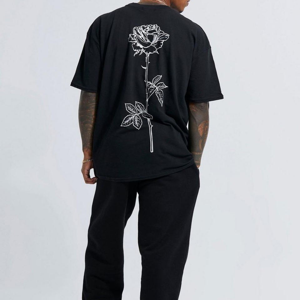 เสื้อยืดผู้ชายพิมพ์ลายก้านกุหลาบลายเส้นสีดำเสื้อยืดผ้าฝ้ายออร์แกนิคเป็นมิตรกับสิ่งแวดล้อม
