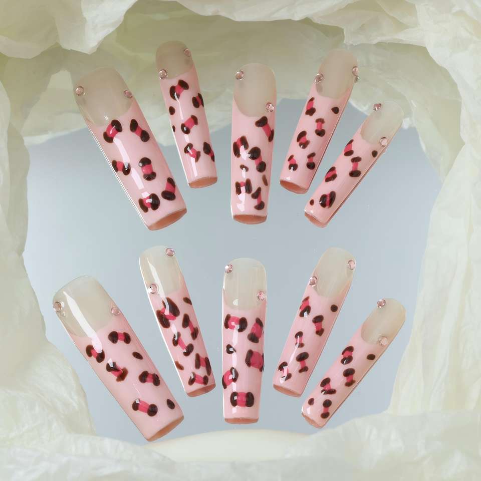 Wholesale high-end handmade acrylic nail art, square full-coverage false nails,pink leopard print,rhinestone design,customizable