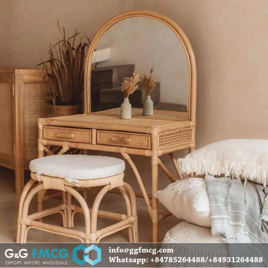 โต๊ะเครื่องแป้งหวายคุณภาพสูงสำหรับห้องนอน ดีไซน์แผงแบบพับได้ ราคาขายส่งจากเวียดนาม