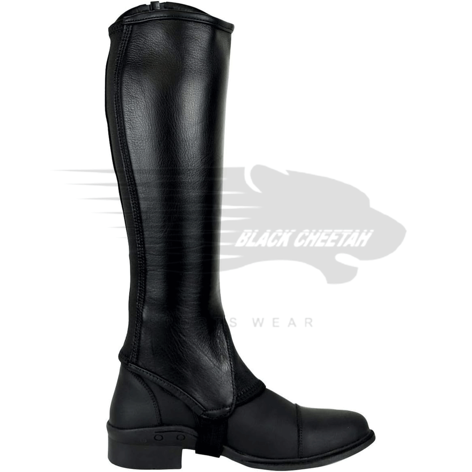 ชุดกีฬาเสือชีตาห์สีดำสำหรับการขี่ม้าหนังแท้แบบซิปด้านข้างแบบครึ่งเดียว