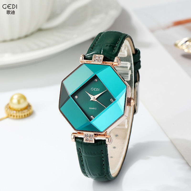 นาฬิกาข้อมือผู้หญิงทรงแปดเหลี่ยมขายส่ง สายหนังรูปทรงเพชร พร้อมกลไกควอตซ์
